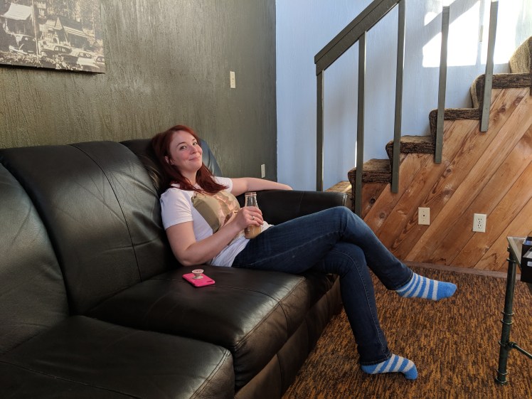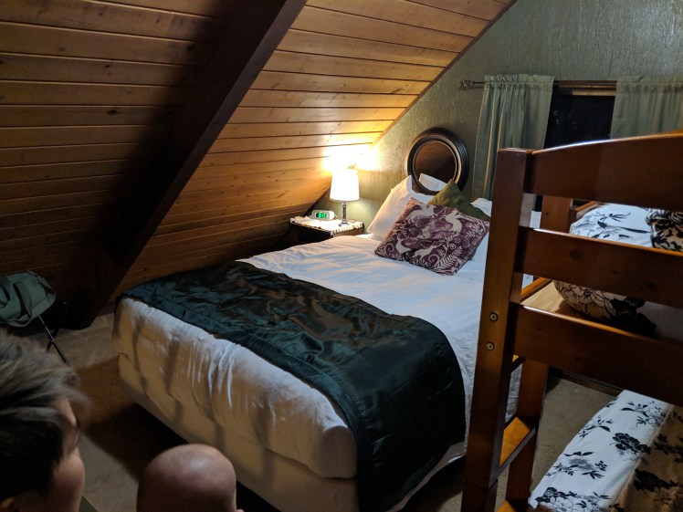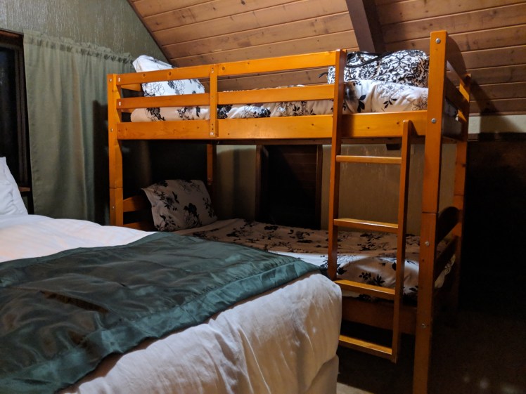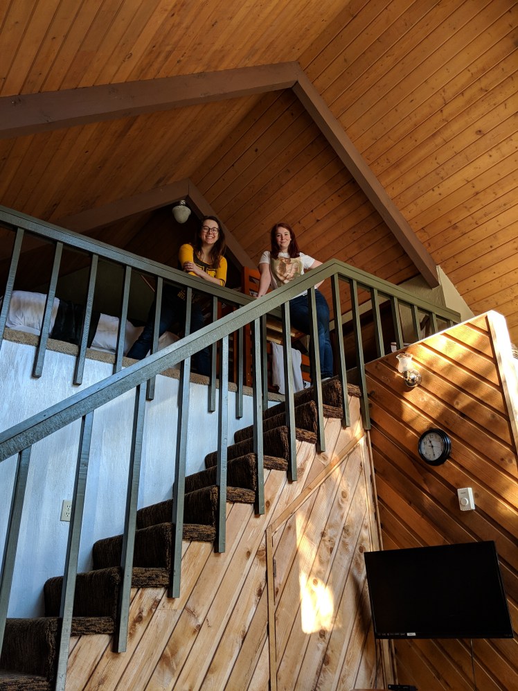 I brought my iPad along so we could connect to the WiFi and watch ‘Friends’ on Netflix. Man, that’s a wild sentence. Technology has brought so much joy and convenience to my life. I love the future! There was an electric fireplace in the living room where we sat playing games with ‘Friends’ on in the background. We snacked on Gardetto’s, gummy bears, and blueberry muffins. The fake fire roared, the cabin was toasty, and before long we drifted toward bed. I curled up in a queen bed next to my sister, and slowly fell asleep.