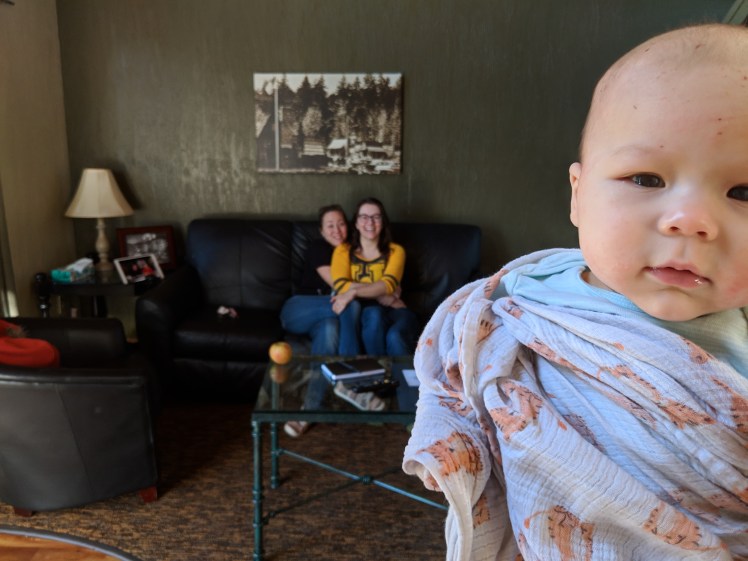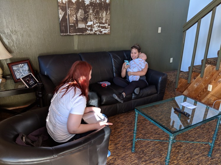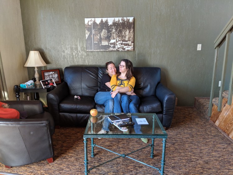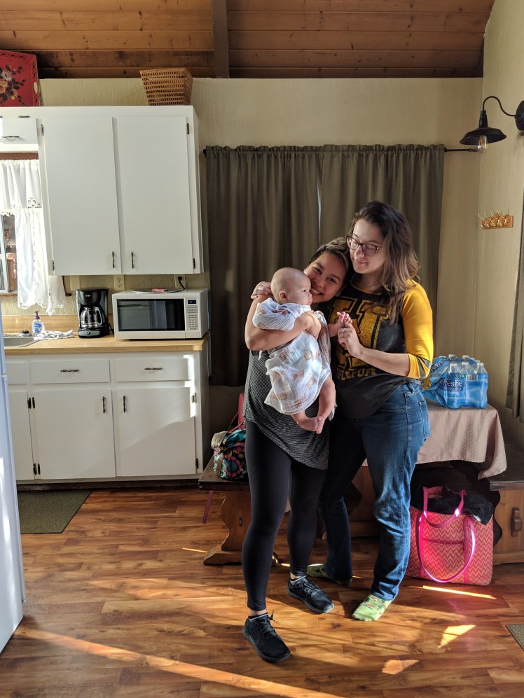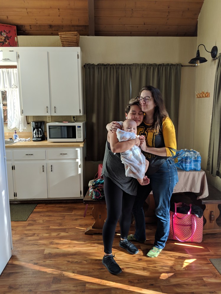 I woke up around 5 in the morning and needed a pee. The cabin was an open plan A frame with stairs to the loft area, and a proper closed off bedroom on the ground floor. Cassidy, Rachel, and I slept in the loft area and Jacki took the bedroom with her wee one. I groped for my glasses and squinted through the dark while feeling my way to the railing of the stairs. The railings were low so part of me was a bit concerned about falling, but I did not. As I walked through the cabin I discovered Jacki. She was in her robe, a huge smile on her face, eating fruit while standing in the middle of the kitchen. This was the first night in weeks that her baby had fallen asleep easy and slept for hours without waking. She felt exuberant and rested, and the vision of her in that moment will be filed away as “bliss” in my memories.